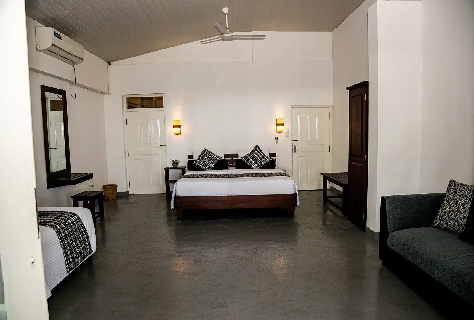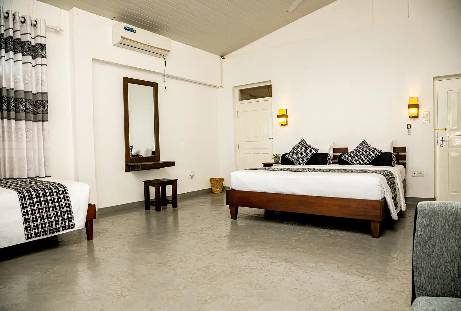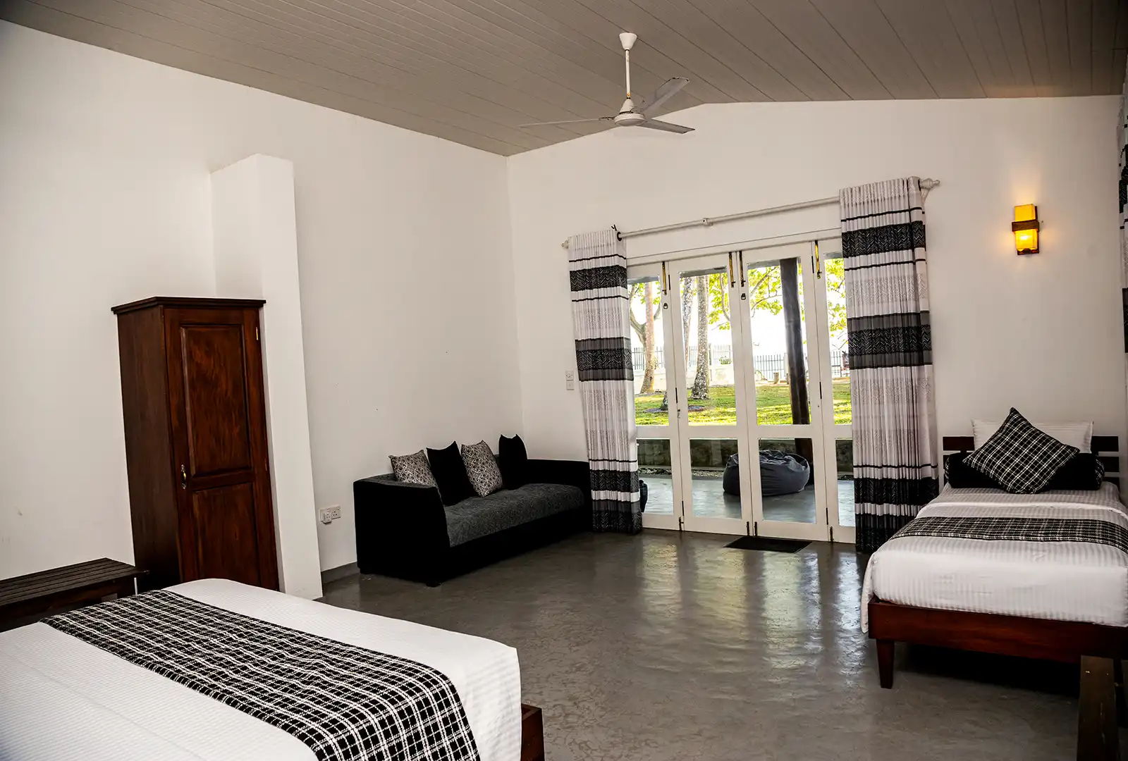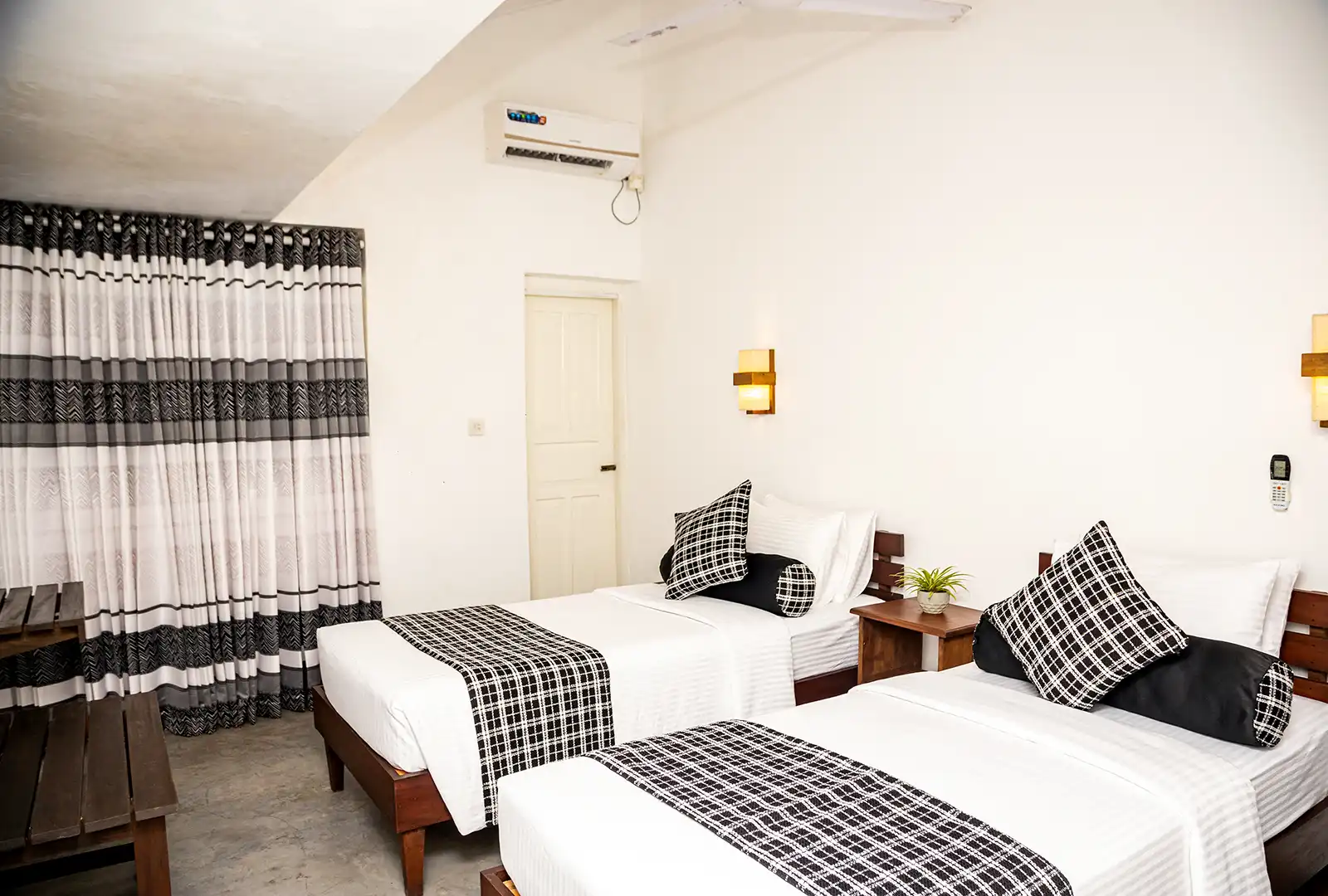 Enjoy a spacious double room with two comfortable single beds, designed for friends or family, and wake up to stunning views of the beach and the gentle sound of waves.