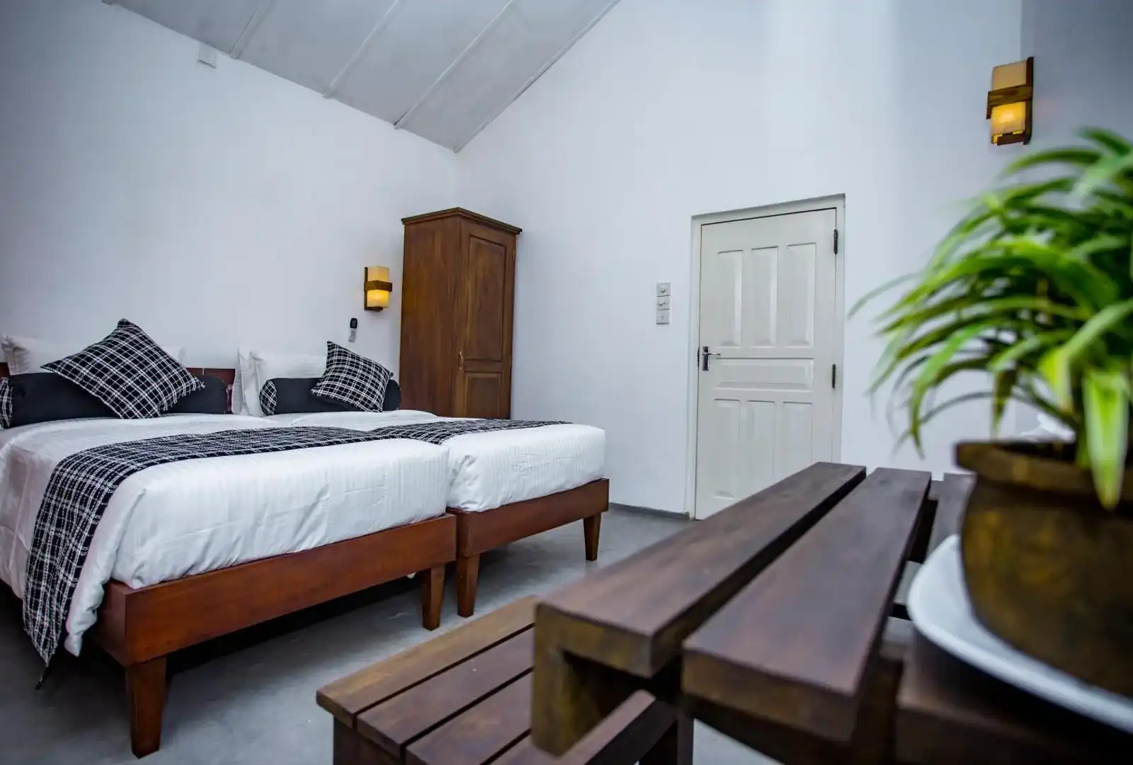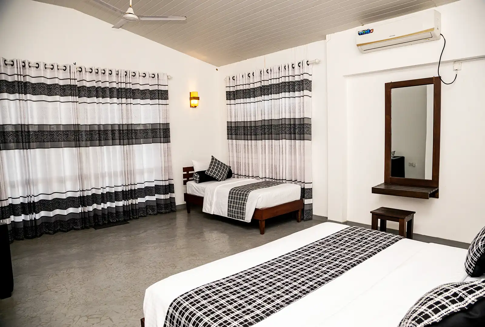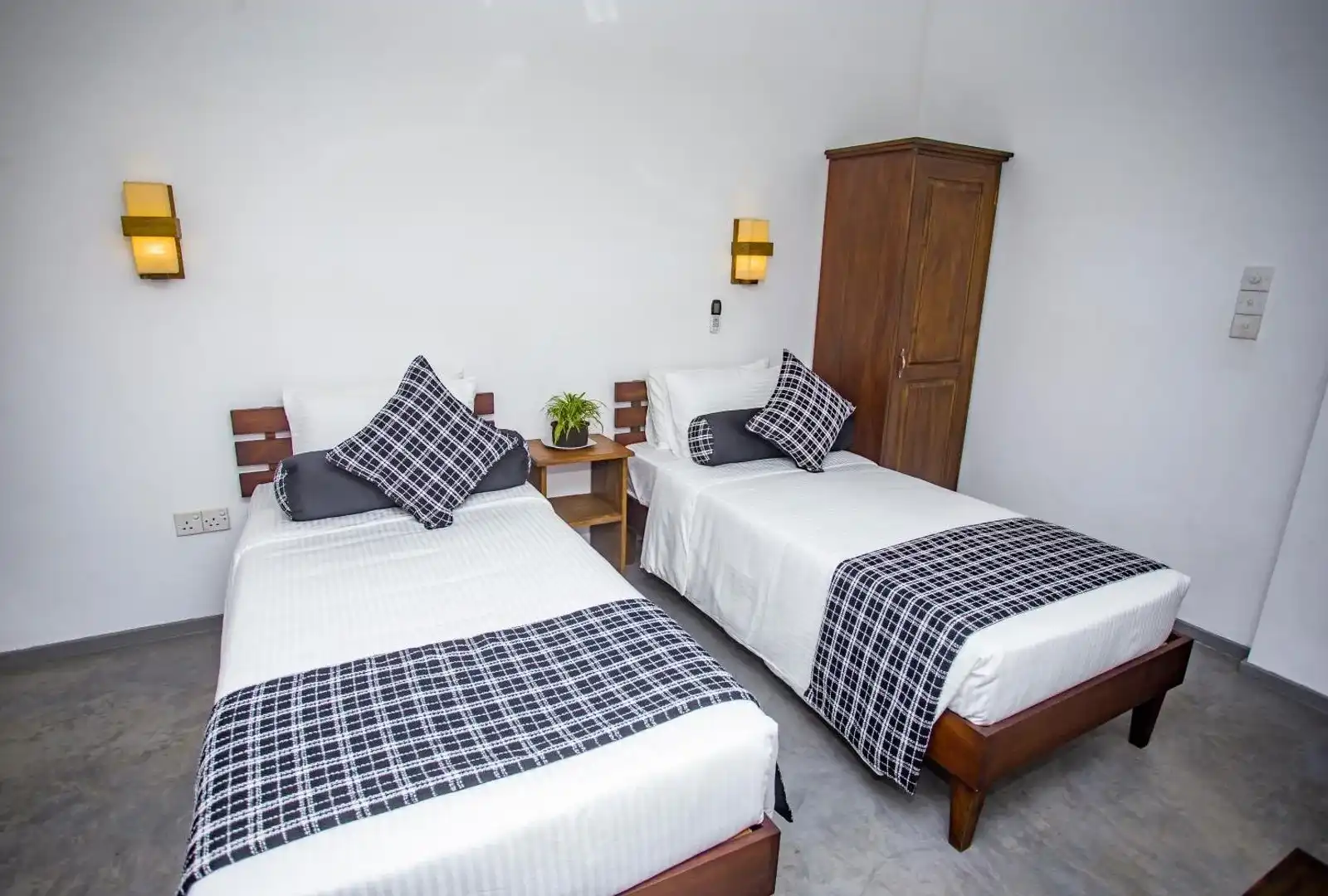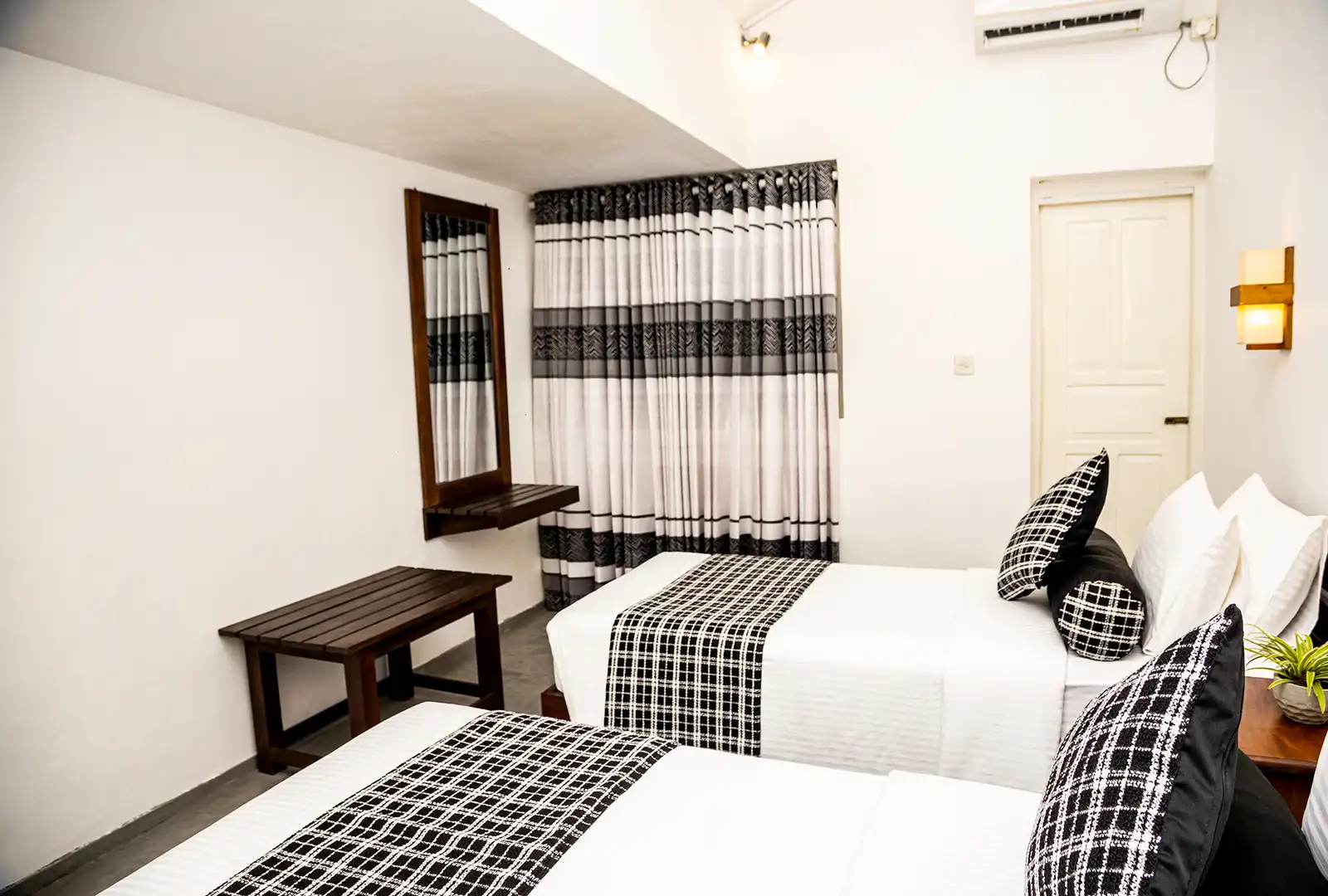Enjoy a spacious double room with two comfortable single beds, designed for friends or family, and wake up to stunning views of the beach and the gentle sound of waves.