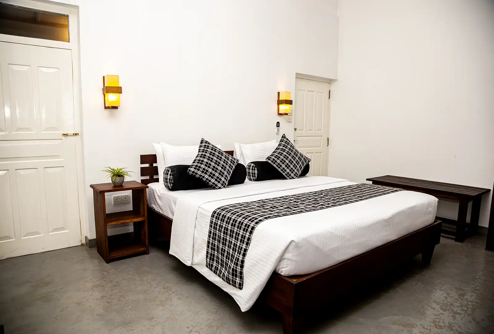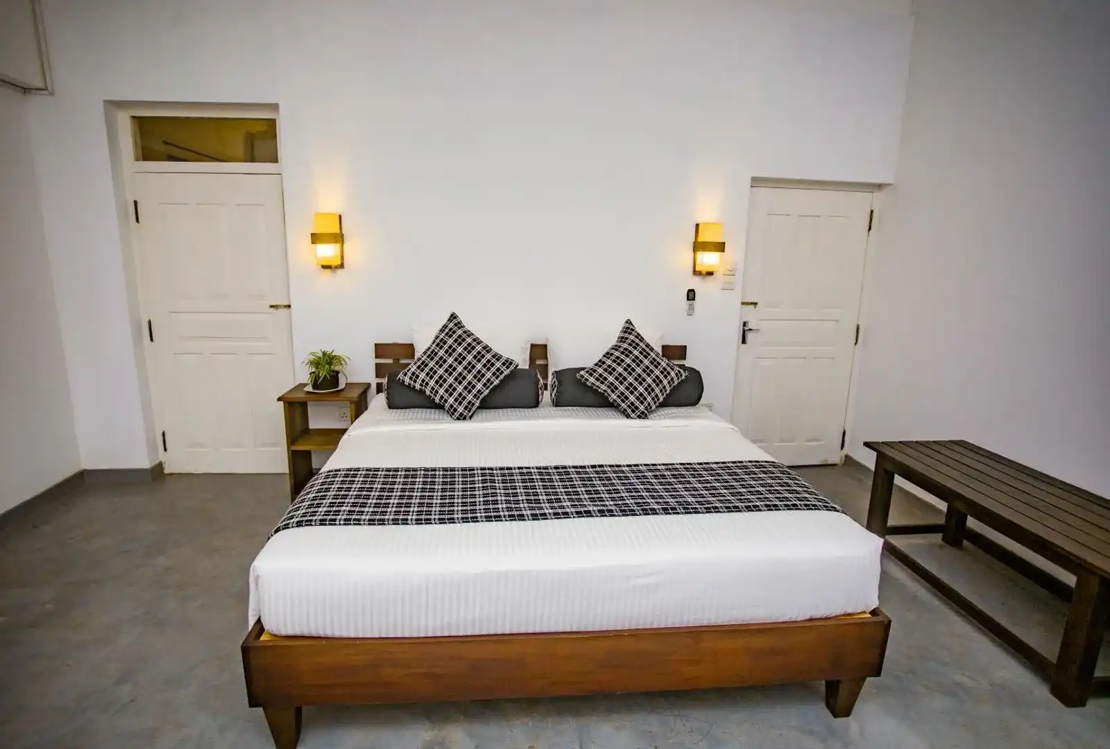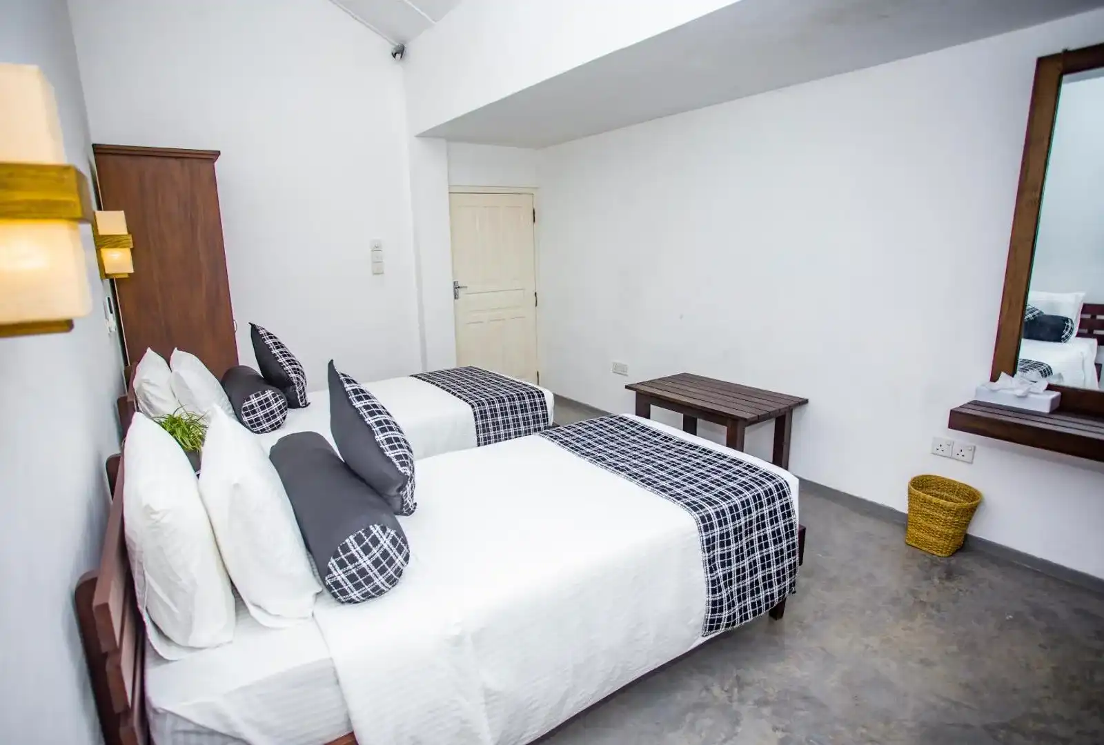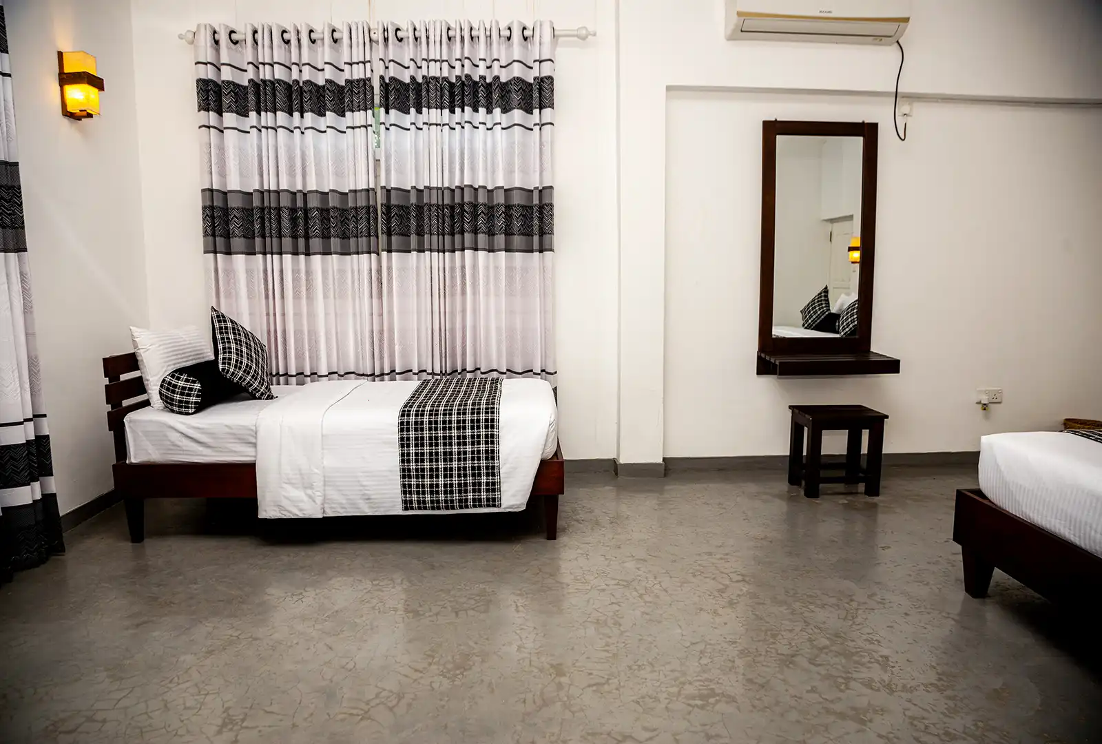 Enjoy a spacious double room with two comfortable single beds, designed for friends or family, and wake up to stunning views of the beach and the gentle sound of waves.