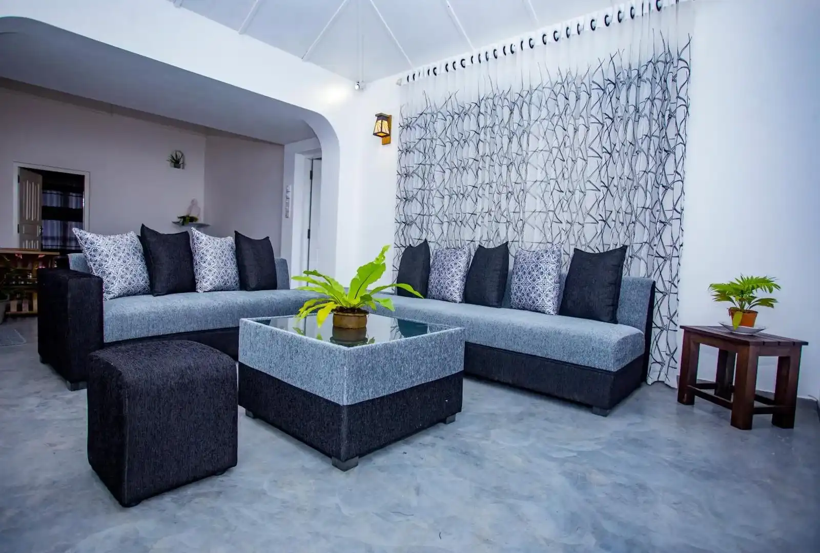 Relax in a spacious living room filled with natural light, comfortable seating, and stylish décor. Enjoy panoramic beach views while unwinding with family or friends.